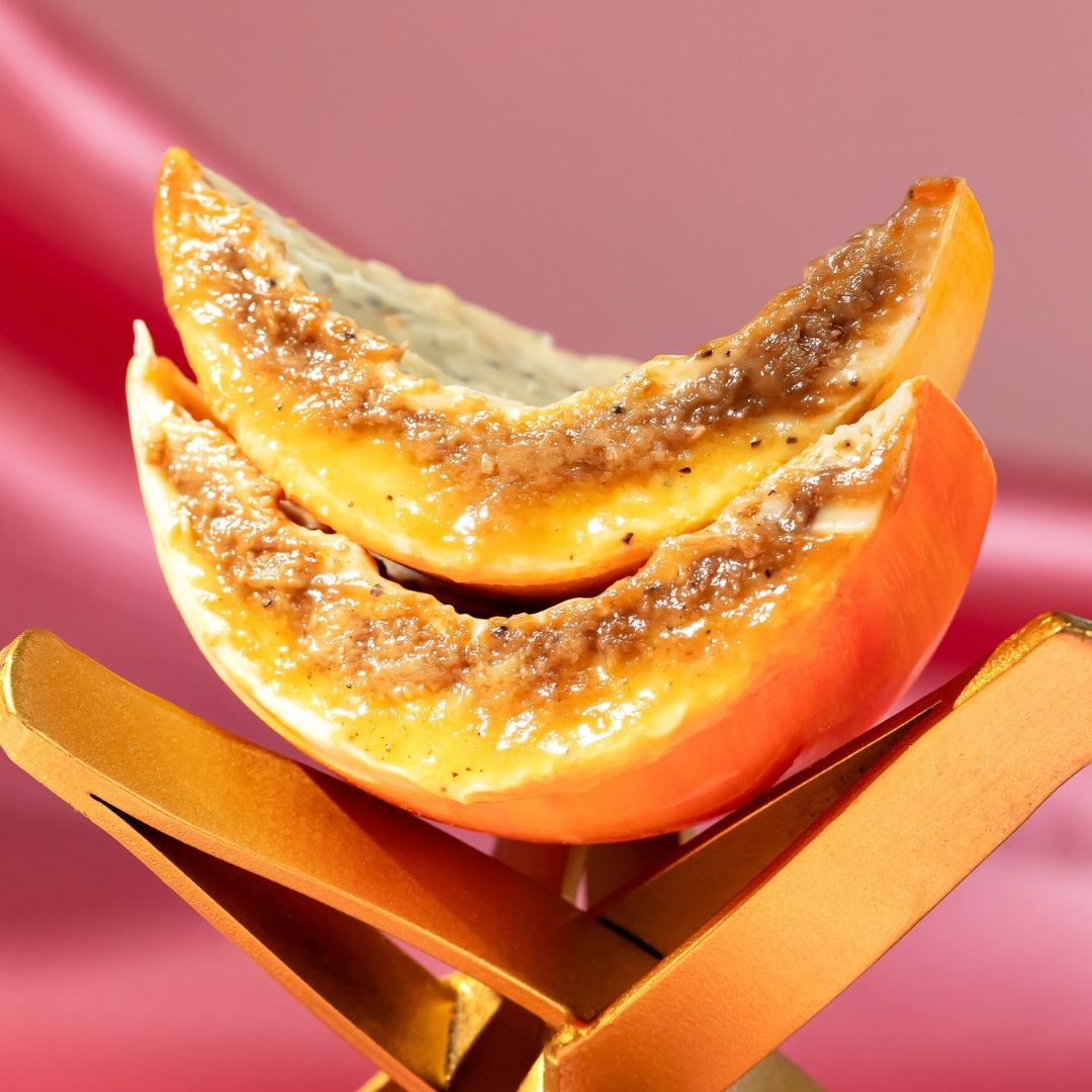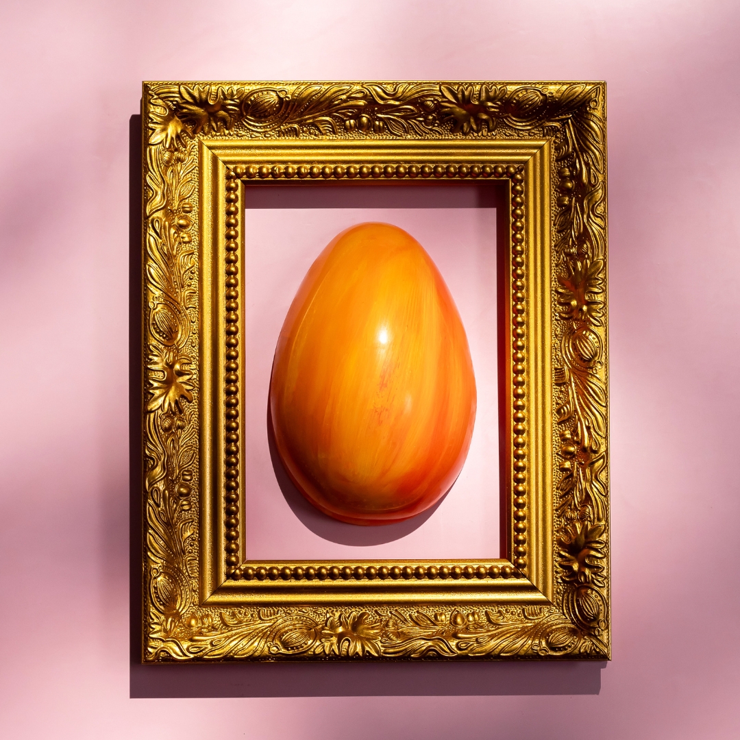 Casca especial pintada à mão de chocolate nobre branco recheada com ganache de maracujá com flor de laranjeira, gianduia de avelã com crocante de coco caramelizado no maracujá, selada com chocolate de maracujá (chocolate nobre branco saborizado com maracujá liofilizado).